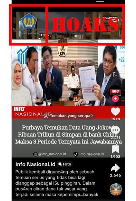 “Berita yang menyatakan bahwa Menteri Keuangan, Purbaya Yudhi Sadewa menemukan data uang Jokowi ribuan triliun [rupiah] di bank China adalah tidak benar atau hoaks.”