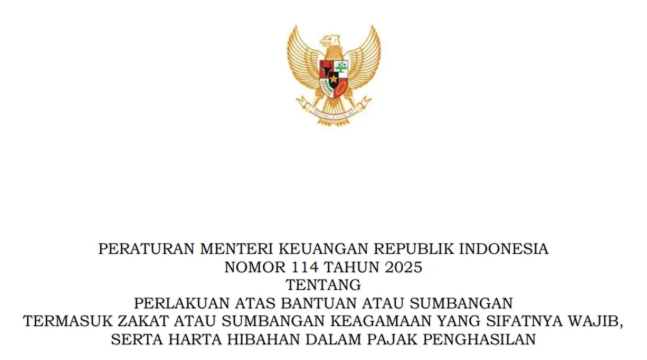 JAKARTA – Kementerian Keuangan resmi menerbitkan aturan baru yang mengubah secara signifikan perlakuan Pajak Penghasilan (PPh) atas bantuan atau sumbangan, termasuk zakat dan sumbangan keagamaan yang bersifat wajib. Aturan tersebut tertuang dalam Peraturan Menteri Keuangan (PMK) Nomor 114 Tahun 2025.