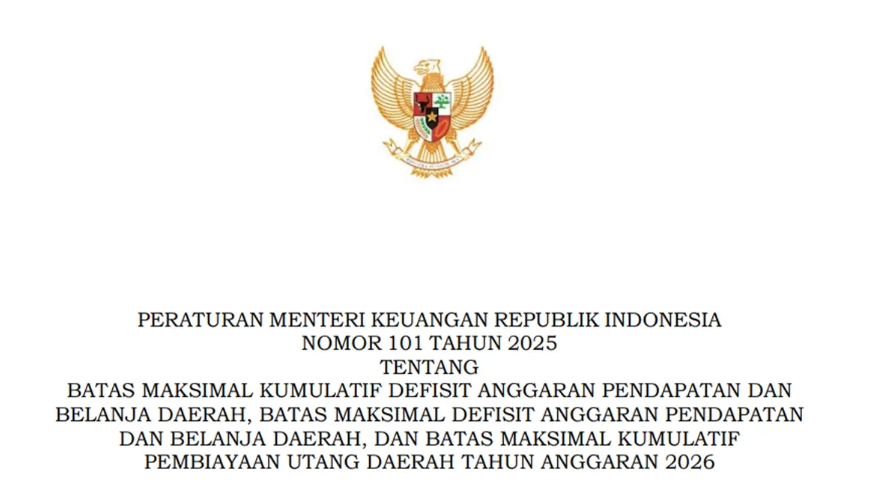 JAKARTA – Pemerintah Pusat resmi memperketat disiplin fiskal daerah untuk tahun depan. Melalui Peraturan Menteri Keuangan (PMK) Nomor 101 Tahun 2025, batas maksimal defisit Anggaran Pendapatan dan Belanja Daerah (APBD) Tahun Anggaran 2026 ditetapkan turun menjadi 2,5% dari perkiraan pendapatan daerah.