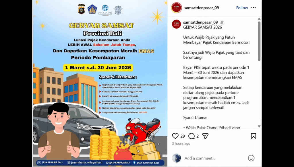 DENPASAR – Sistem Administrasi Manunggal Satu Atap (Samsat) Denpasar, Bali menggelar program Gebyar Samsat 2026 dengan menawarkan hadiah undian berupa emas bagi wajib pajak yang membayar pajak kendaraan bermotor (PKB) tepat waktu.